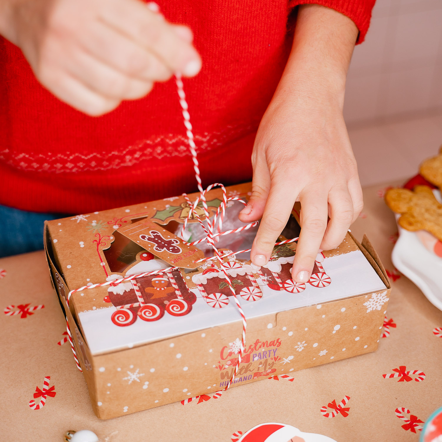 CONTENUTO: biscotti in varie forme, casetta di Babbo Natale da assemblare, ghiaccia in vari colori (1 rosso, 1 bianco, 1 verde), 3 sacchetti di zuccherini e decorazioni, personaggi di zucchero, istruzioni